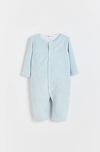 Plain plush footie with Pima cotton linning featuring a signature print. The style features long sleeves, a footless design, and snaps all the way down the front from the neck to the toes. The footie is perfect for dressing and keeping your baby warm.