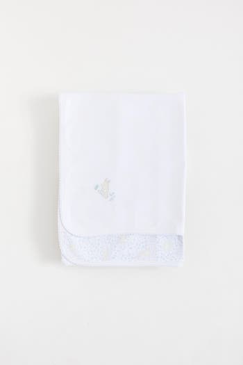 Pima cotton blanket, made of soft cotton for gentle contact with baby's skin. It features a print on one side, and a plain Pima cotton blanket with a signature embroidery on one end. Measuring approximately 73 x 69 cm, it's perfect for covering or swaddling your baby, providing extra comfort and warmth. A practical and cozy option for caring for and protecting your baby at all times.