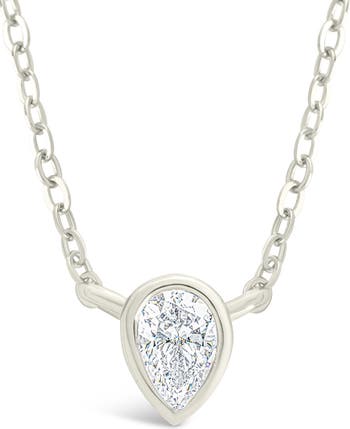 A singular cubic zirconia sits perfectly in the center of a pear-shaped pendant on a delicate chain necklace done in a high-shine finish.
