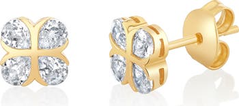 These sparkling stud earrings create a clover effect with four pear-shaped cubic zirconia framed in a cross-like setting of platinum plate or 18-karat-gold plate.