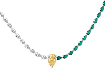 Elevate your look with this dazzling choker, featuring a striking pear-cut yellow center stone flanked by alternating emerald-green and brilliant white stones. The sleek, collar-style design hugs the neckline for a bold yet refined finish. This show-stopping piece is perfect for evening glamour, weddings, or upscale events