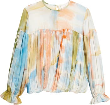 Printed with imagery drawn from Helen Frankenthaler's 1957 painting Western Dream, this silk chiffon top transforms expressive brushstrokes and desert landscapes into wearable art. The loose silhouette is softly draped for graceful movement with a smooth yoke and abundant pleats through the bodice and long sleeves.