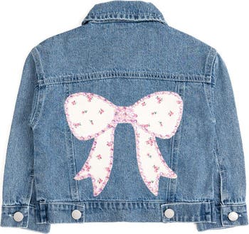 This adorable little girls’ denim jacket features a statement pink bow on the back, outlined with shimmering pearls and sparkling gemstones for the ultimate touch of sweetness. A perfectly playful layer that adds sparkle to every outfit!