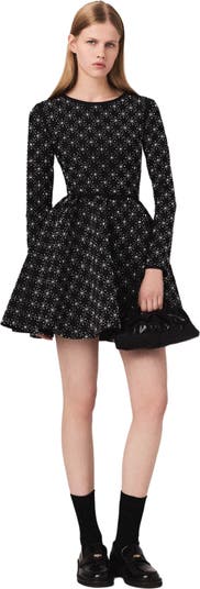 The night comes alive, silhouettes shimmer and take centre stage. Maje unveils pieces designed to shine after nightfall.Elegant and radiant, this babydoll dress combines a fitted top with a flared skirt with an airy volume. The long sleeves give the silhouette structure, while the ornamentation highlights its exquisite character. Fully covered in rhinestones and beads, it catches the light from every angle and offers a sophisticated look, designed for evenings where every detail counts. To elevate this piece, pair it with leather loafers, a mini clutch and a rhinestone velvet bow in your hair to accentuate its sparkle.
