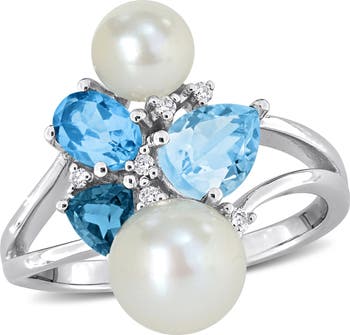 This ring showcases London, Swiss and sky-blue topaz gemstones accompanied with cultured freshwater pearls and diamond accents, all set in 14k white gold. The combination of sparkling topaz, lustrous pearls, and glittering diamonds creates a piece of unmatched beauty and sophistication. It's an ideal accessory for adding a touch of glamour to any outfit.