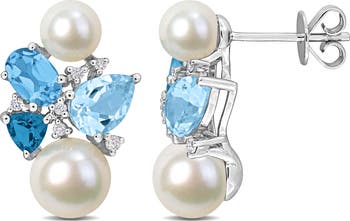These exquisite earrings feature a stunning array of blue topaz and diamond accents, elegantly paired with cultured freshwater pearls, all set in 14k white gold. The radiant blue topaz complements the lustrous pearls, while the diamonds add a touch of sparkle, creating a sophisticated and timeless accessory. Perfect for special occasions, these cluster earrings are sure to draw admiration.