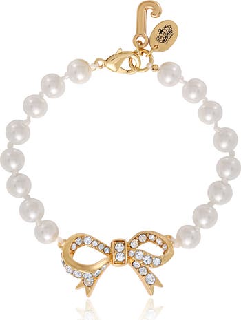 Elevate your wrist game with this elegant pearl bracelet from Juicy Couture, adorned with a sparkling crystal-studded bow. It’s a chic mix of classic femininity and playful charm—perfect for gifting or treating yourself.