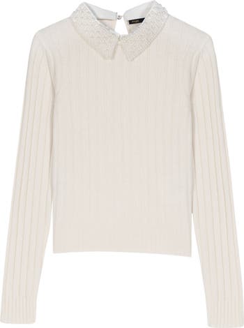 The collection reinterprets city style with pieces that are both structured and refined.This short, fitted knit sweater transforms throughout the day thanks to a removable Peter Pan collar, fully embroidered with pearlescent beads, or can be worn for a more minimalist look with a simple round neck. The refined details, like the delicate back fastening and ribbed trim, make all the difference.Wear it with grey flared jeans and a Miss M bag for a contrast between sophistication and metropolitan casualness.