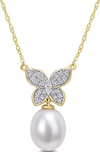 Pearl & Diamond Butterfly Drop Necklace 10k