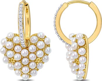 Immerse yourself in the enchanting allure of these hoop heart earrings, featuring delicate 2-2.5mm cultured freshwater pearls embraced by a stunning arrangement of diamonds, all set in lustrous 14k yellow gold. The pearls, a symbol of purity, harmonize with the brilliance of the diamonds, forming a captivating heart-shaped design that exudes elegance and charm. Meticulously crafted with attention to detail, these earrings are a testament to timeless sophistication, offering a graceful and luxurious accent to elevate any attire with their radiant allure.