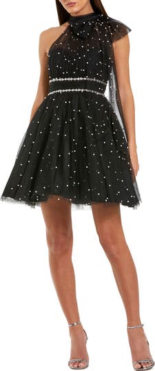 Playful black tulle mini dress with pearl accents, illusion halter neckline, and statement bow—perfect for parties, receptions, or night-out glam.