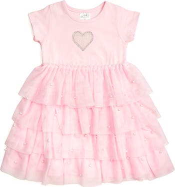This sweet pink tutu dress features a sparkling rhinestone heart and tiered tulle skirt adorned with dainty pearls—perfect for twirling in style.