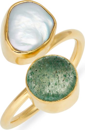 A lustrous freshwater pearl and green quartz evoke foam-capped ocean waves on this vermeil wrap ring handcrafted in Hawaii.