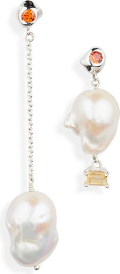 Two freshwater pearls glow on the polished mixed-length chains of these mismatched drop earrings with three lab-created orange sapphires bringing the sparkle.