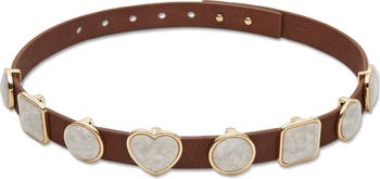 - ∙ Walnut pebbled leather ∙ Hand-embellished with mother of pearl heart, square and round shaped stones ∙ 14k gold plated bezel settings ∙ S/M measures 28" ∙ L/XL measures 34" ∙ Features overlapping collar stud closure ∙ Spot clean, store in custom cloth pouch