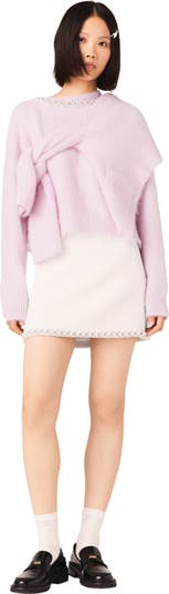 A confident look and exquisite details: the ecru tweed-effect A-line skirt is a statement piece, blending Parisian chic with modern sparkle. Its mini cut highlights the rich texture of the tweed, while a band of sparkling jewels illuminates the hem, revealing an elegant contrast between matte and shine. Wear it with the lilac sweater, patent loafers and the rhinestone barrette for a sophisticated and playful look.
