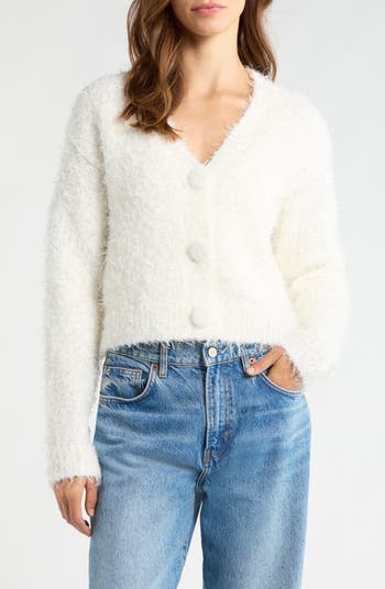 Knit from richly textured yarn in a slightly shrunken silhouette, this V-neck cardigan styled with covered buttons adds a dash of lightweight warmth to cool-weather ensembles.