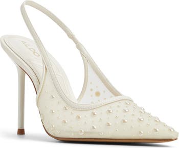 Pearly beads add elegant luster to the mesh upper of a pointy-toe pump secured with an elasticized slingback strap and lofted by a towering pin heel.