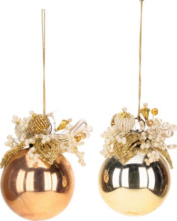 These are two elegant pearlized Christmas ball ornaments in metallic tones—one rose gold and the other gold. Each ornament is adorned with intricate embellishments of faux pearls, gold beads, and delicate leaves, creating a luxurious and festive look. Suspended by fine gold strings, they add a touch of sophistication and sparkle to any holiday décor.