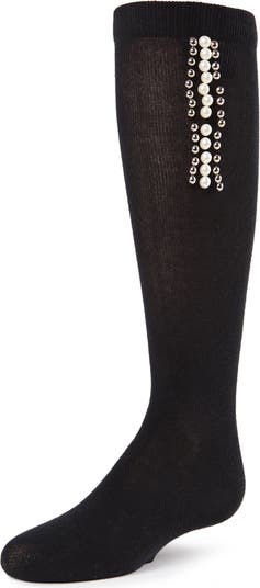Neat little pearls all lined up -- one line of large white pearls, flanked by smaller silver ones on either side. Pearls and Stripes crew socks were meant to be showcased with shorts, skirts and dresses! Ultra-soft combed cotton fabric wicks away moisture, while the fasteners which secure the pearls to the sock leg won't rub or poke little legs.