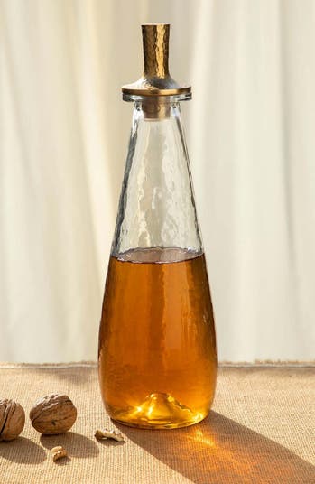 Our handcrafted Pebbled Glass Decanters feature punt bases and tall, hammered aluminum stoppers in an antiqued brass finish.
