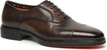 Richly pebbled Italian leather brings texture and distinction to an oxford crafted with minimal detailing save for a plain cap toe crowning an unadorned vamp. It sits on a dark rubber sole with a signature orange inset in the tread to ground every step in sartorial confidence with a subtle branded kick.