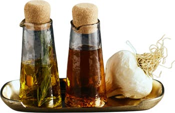This set of two petite, cork-topped carafes combines delicate craftsmanship with versatile functionality. Perfectly sized for use as oil and vinegar cruets on the dining table, they bring understated elegance and texture to everyday meals. Beyond the kitchen, these charming vessels also serve beautifully as containers for your favorite bath oils or potions, offering a thoughtful touch of refinement wherever they’re placed. The gently pebbled glass surface enhances grip and visual appeal, making these carafes as practical as they are graceful.