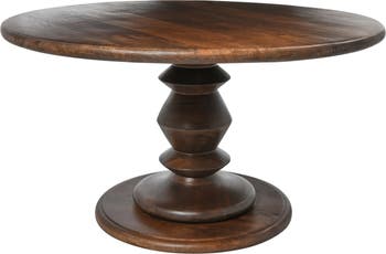 - This round solid wood pedestal coffee table features a thick rounded edge top and a heavy solid wood base