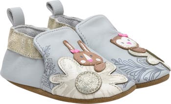 This adorable appliquéd crib shoe is designed for a roomy, comfortable fit with a wide toe box that provides extra space for feet to grow and move freely. The soft suede sole is ultraflexible, promoting a full range of motion and healthy foot development and is also slip-resistant, helping prevent tumbles during those wobbly first steps.