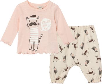 A fanciful French cat says hello at the front of a darling ruffle-trimmed shirt paired with coordinating print pants.