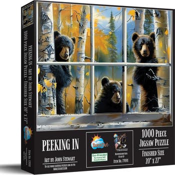 Unveil the allure of nature with "Peeking In," a delightful 1000-piece jigsaw puzzle by distinguished artist, John Stewart, brought to you by SunsOut puzzles. This artistic creation captures the calm elegance of curious bears within a beautiful autumn scene, inviting the tranquility of the outdoors into your living space with its 20" x 27" finished scope. As committed supporters of the environment, SunsOut uses eco-friendly soy-based inks and recycled boards to craft our puzzles, drawing upon top-quality American craftsmanship for our precision-cut interlocking pieces. The puzzle, made of robust recycled cardboard, is easy to handle and remains a prized charm for years. Encased within an attractive large display box that highlights the radiant artwork, your puzzling journey promises fulfilling creativity whether you're a seasoned enthusiast or seeking a peaceful reprieve. As a proud woman-owned small business, SunsOut guarantees customer satisfaction, pledging to redress any missing or damaged pieces. Perfect for grown-ups who appreciate intricate artwork and nature's calming force, "Peeking In" offers more than just a puzzle. It's the perfect gift for loved ones, a calm escape into artistry and a lasting tribute to the animal kingdom's beauty, all while supporting a greener world. Dive in - piece by piece, reward by reward.