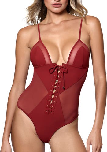 A daring evolution of our iconic Peep Show collection. The Peep Show One Piece blends luxurious Italian Swim Jersey with sheer Italian Mesh for a captivating balance of coverage and tease. Featuring a lace-up front and mesh panels that contour the waist and frame the bust in a flattering triangle silhouette.