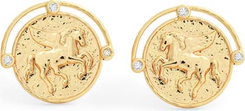 Bring a flight of fancy to your look with these gold-plated stud earrings featured a coin-minted design centered with a bas-relief Pegasus and flanked with sparkling crystals.