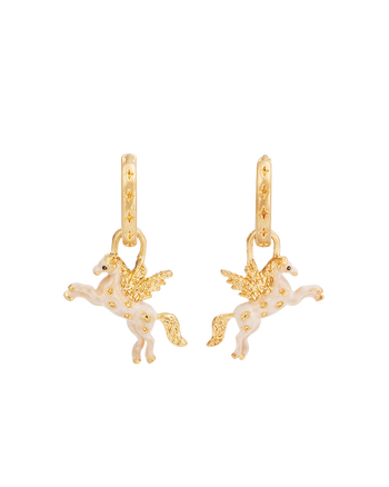 Let your style soar with our Pegasus Huggie Earrings. These charming gold-toned hoops feature star-engraved detailing with beautifully crafted Pegasus charms in white enamel and gold accents. Perfect for adding a whimsical statement to any look, wear them solo or mix and match with your favourite earrings for a playful, layered effect.