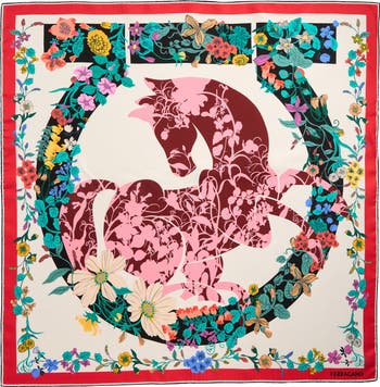 Celebrate the Year of the Horse with this elegant Italian-silk twill scarf featuring an oversized Gancini frame encircling a flower-filled Pegasus. This design highlights Salvatore Ferragamo’s beloved 'petalo' technique, where delicate blossoms come together to form intricate imagery.