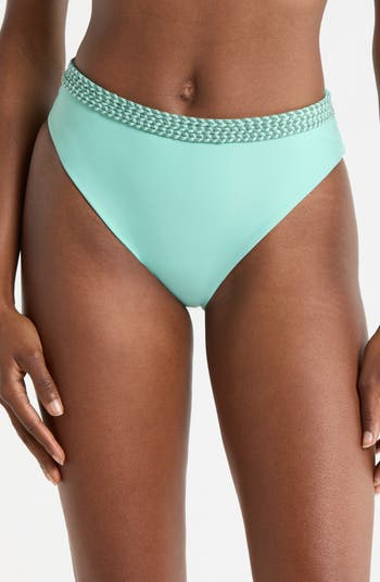 A shimmering trim wraps around the waistband of these classic bikini bottoms with moderate back coverage.