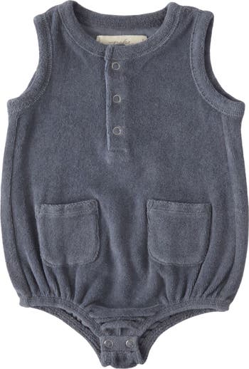 Supersoft organic-cotton terry keeps them feeling cozy in this bubble romper made with little patch pockets in front.