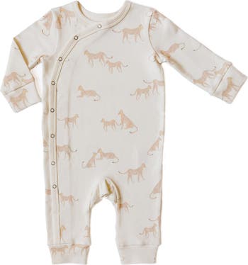 An artsy cheetah pattern puts a fun twist on a long-sleeve romper made from soft organic cotton.