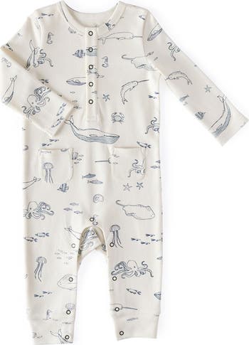 Friends of the deep bring the ocean's wonders with your little one wherever they go in this henley-style romper cut from soft and breathable organic cotton.
