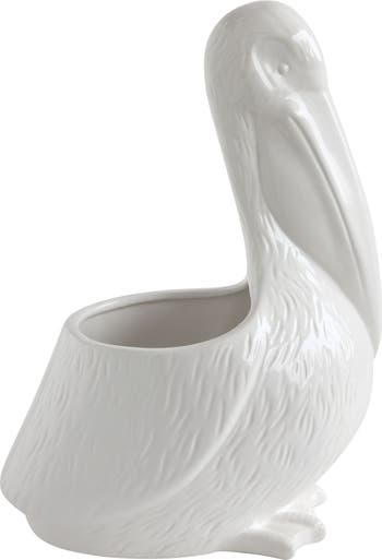 This graceful white ceramic pelican planter adds fun and personality to any home or garden. This planter is designed to look like a cute and quirky pelican design with a round back. The back opening is ideal for displaying a plant, flower, or succulent in any indoor or outdoor setting. The planter is made of durable dolomite ceramic that is smooth and durable, ensuring that it can last for a long time. The planter is white that gives it a clean and elegant look. The planter also has a realistic and detailed design that captures the charm and character of the pelican. Whether it is placed on a porch, patio, balcony, or windowsill, this pelican planter adds a touch of coastal charm and whimsy to any space. It also makes a great gift for any animal lover or gardener. This planter measures 9.5 inches long, 6.5 inches wide, and 13.5 inches high. This white ceramic pelican planter is a cute and quirky way to display and grow plants in style.