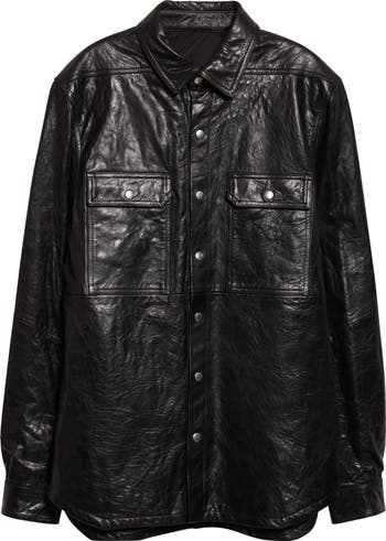 Vegetable-tanned, rumpled leather brings softened ruggedness to this shirt-jacket detailed with brushed-metal snaps and lined for comfortable solo wear.