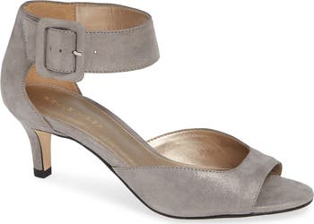 Caressably soft leather composes an elegant dress sandal with an alluring oversized buckle.