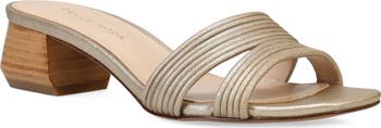 A geometric block heel lends fun flair to this metallic suede sandal designed with tubular straps and a cushioned footbed for comfort.