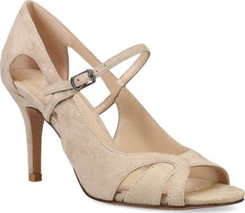 Cutout detailing emboldens this peep-toe pump made from soft suede and fashioned with a mary jane strap and sleek, tapered heel.