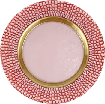 Designed to add shimmer, color and a touch of glamour to any table, this richly textured glass charger features a pearlescent finish that frames your dinnerwear in a halo of distinction. Mix and match it with your favorite pieces to bring polish to formal occasions and a bit of fun to everyday meals.