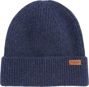 A logo-embossed leather patch brands this cuffed knit beanie in a cozy rib stitch.