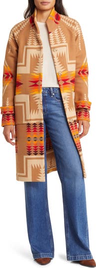 Southwest-inspired geometric shapes take over a longline coat cut from a rich virgin-wool blend that's sure to keep you cozy throughout the cooler seasons.