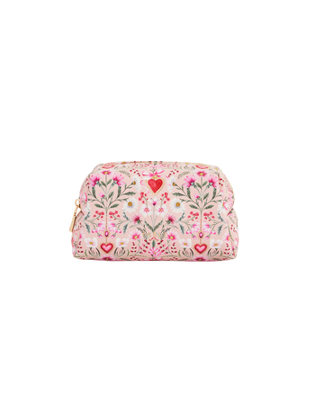 Step into a flourishing garden with our Penelope Floral Heart Pink Cosmetic Pouch. Crafted in pastel blush faux leather, it is adorned with joyful blooms and delicate heart detailing, capturing the sweetness of a garden in full flower. Finished with gold-tone touches for a hint of sparkle, this charming pouch is your faithful travel companion.