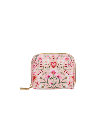 Carry a whisper of romance with our Penelope Pink Floral Heart Small Purse. Adorned with joyful blooms and tender heart detailing, this pastel pink treasure brings a soft shimmer of gold-tone charm to your everyday moments. Inside, thoughtfully arranged pockets and card slots keep your little essentials neatly tucked away.