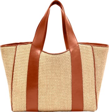 Woven raffia and smooth leather lend visual intrigue to a spacious tote bag perfect for storing your essentials while on the go.